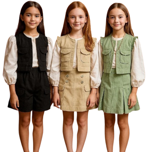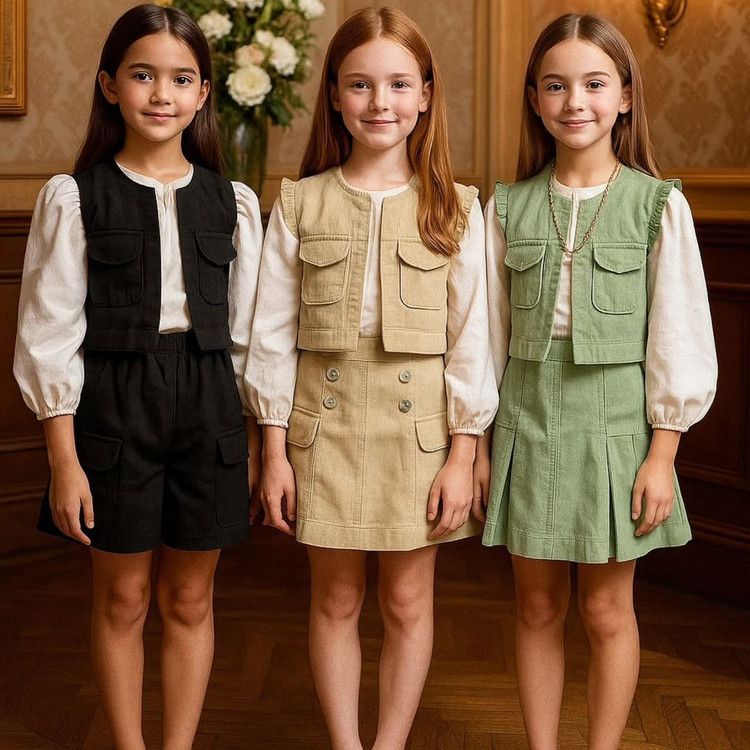 لباس مجلسی ژیله دامن کتان ۲ رنگ سبز و نسکافه ای سایز ۵ تا ۱۲ سال